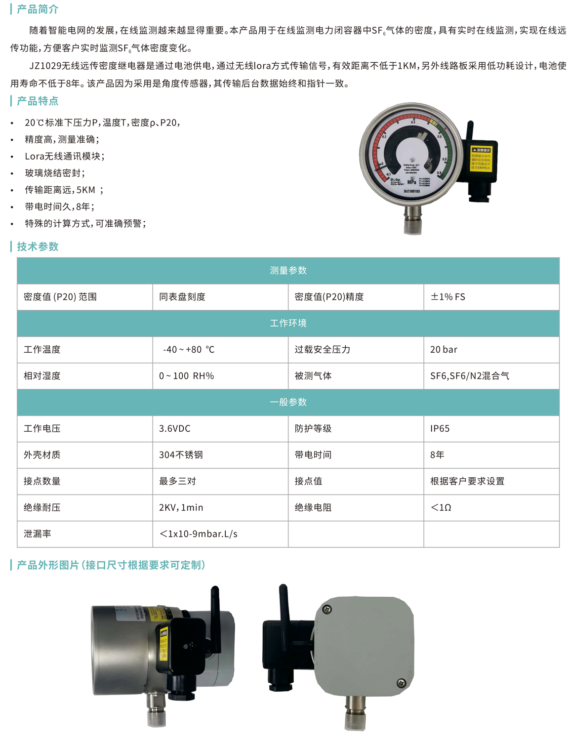 JZ1029無(wú)線(xiàn)遠(yuǎn)傳密度繼電器是通過(guò)電池供電,通過(guò)無(wú)線(xiàn)or方式傳輸信號(hào),有效距離不低于1KM,另外線(xiàn)路板采用低功耗設(shè)計(jì),電池使用壽命不低于8年。該產(chǎn)品因?yàn)椴捎檬墙嵌葌鞲衅?,其傳輸后臺(tái)數(shù)據(jù)始終和指針一致。