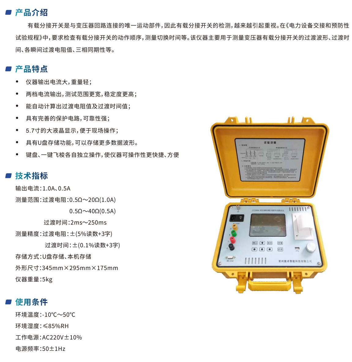 有載分接開關(guān)是與變壓器回路連接的唯一運動部件,因此有載分接開關(guān)的檢測,越來越引起重視。在《電力設(shè)備交接和預防性 試驗規(guī)程》中,要求檢查有載分接開關(guān)的動作順序,測量切換時間等。該儀器主要用于測量變壓器有載分接開關(guān)的過渡波形、過渡時 間、各瞬間過渡電阻值、三相同期性等。