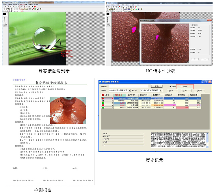 憎水性分析軟件根據(jù)檢測人員在現(xiàn)場獲取的絕緣子噴水后圖像,可對現(xiàn)場拍攝提取圖像作一些常規(guī)的處理,準(zhǔn)確判斷圖象中水珠形狀所代表的靜態(tài)接觸角和絕緣子的憎水等級。系統(tǒng)圖象的預(yù)處理軟件設(shè)置了基本的圖象處理功能,如:剪切、粘貼、放大、縮小、中值濾波和圖像旋轉(zhuǎn)。圖像處理功能可以進一步改善圖像質(zhì)量,但是通常不必使用預(yù)處理功能,就可以對圖象的憎水等級進行判斷,通過兩種分析結(jié)果可直觀判斷出被測試品當(dāng)前的憎水性能。
