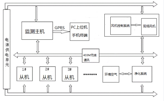 本發(fā)明針對現(xiàn)有技術(shù)的不足,設(shè)計(jì)了一種基于GPRS技術(shù)、改進(jìn)后的433M無線數(shù)傳技術(shù)和智能傳感器技術(shù)相結(jié)合的多功能環(huán)境遠(yuǎn)程監(jiān)測凈化系統(tǒng),它不僅能同時(shí)對多個(gè)監(jiān)測點(diǎn)進(jìn)行多種環(huán)境氣體數(shù)據(jù)采集、環(huán)境溫濕度進(jìn)行監(jiān)測、就地風(fēng)機(jī)控制、空氣環(huán)境凈化等功能,而且能夠基于改進(jìn)后433M無線通信協(xié)議將各個(gè)從機(jī)采集的數(shù)據(jù)匯聚到主機(jī),主機(jī)則通過GPRS網(wǎng)絡(luò)將數(shù)據(jù)傳輸?shù)竭h(yuǎn)程服務(wù)器,用戶可通過電腦或者手機(jī)上網(wǎng)實(shí)時(shí)查看環(huán)境空氣數(shù)據(jù)以及現(xiàn)場查看監(jiān)測系統(tǒng)工作狀態(tài)。